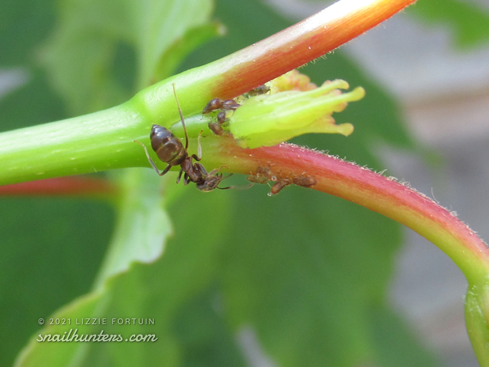 These pics are from June 12 & 13. Some species of ants have a symbiotic relationship with aphids. The aphids feed on plant sap and produce a sugary secretion called honeydew that the ants eat. The ants “milk” the aphids by stroking them with their antennae to stimulate them to produce more honeydew for them to eat. The ants will in turn guard the aphids from other predators.